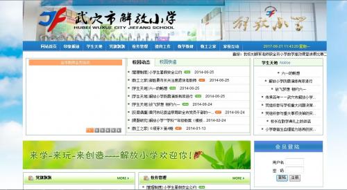 武穴市解放小学官方网站,使用蓝绿两种主色调,在教育类型界面上增添了生动,请点击域名欣赏:www.wxjfxx.com 解放小学已有100多年的历史。现有18个教学班,下辖后坝街、樟树下两个校区,校园面积14500平方米,建有气势恢宏的教学大楼5栋、多媒体教室、远程教育、多功能阶梯教室、训练大厅等一应俱全。师资力量雄厚,教职工77人,其中中学高级教师1人,小学高级教师69人,本科学历21人,专科学历45人。已形成了良好的教育教学及育人环境。